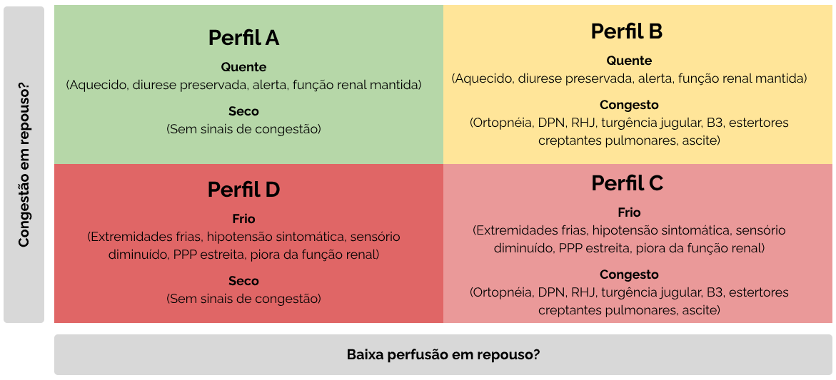 • Perfil A (quente e seco): sem congestão, boa perfusão → ajuste medicações orais