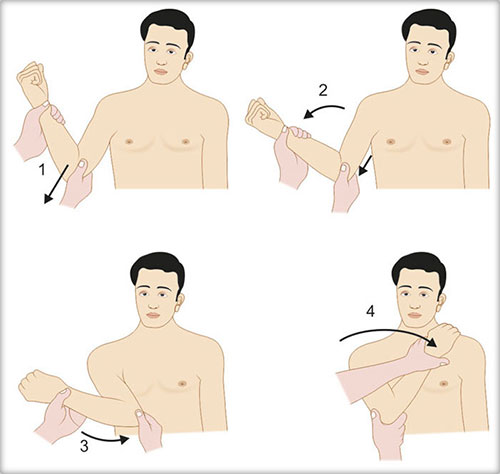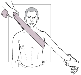- O médico segura o cotovelo junto ao tronco com uma mão e o punho com a outra.