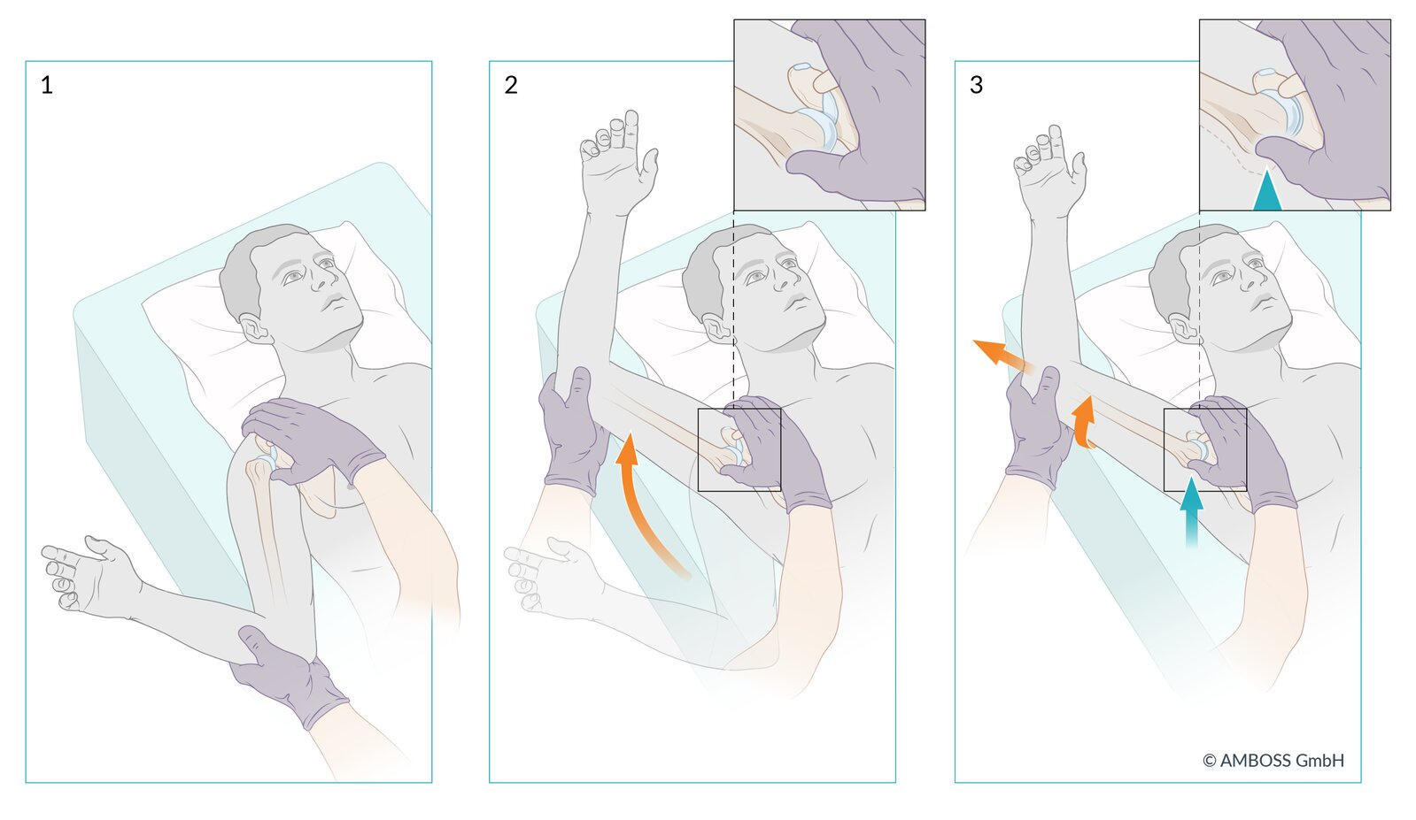 - O médico segura o punho ou antebraço do paciente e aplica tração contínua no sentido do eixo do úmero, com força progressiva e mantida.