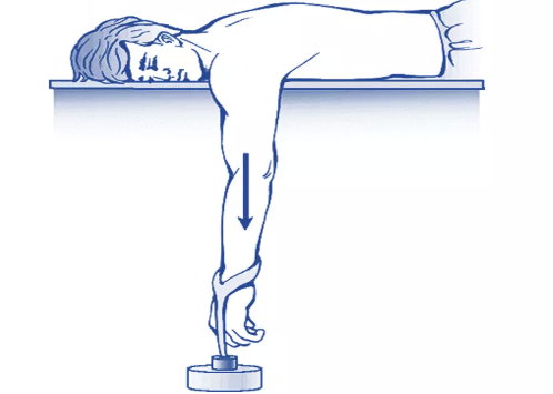- O paciente é colocado em decúbito ventral, com o membro afetado pendente além da borda da maca.
